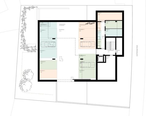 Das Untergeschoss beinhaltet die Parkierung mit 2 Parkplätzen und 1 Besucherparkplatz pro Wohnung. Jede Wohnung verfügt über Abstellflächen sowie ein Kellerabteil.